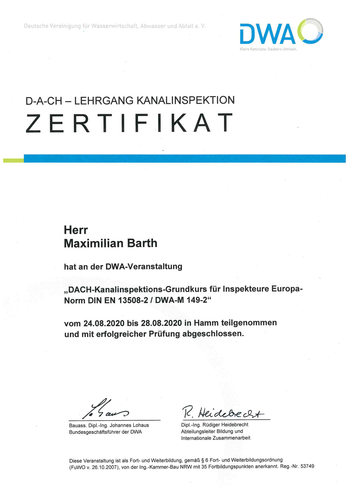 Kanal-TV-Inspektion und Schadensklassifizierung absolviert.